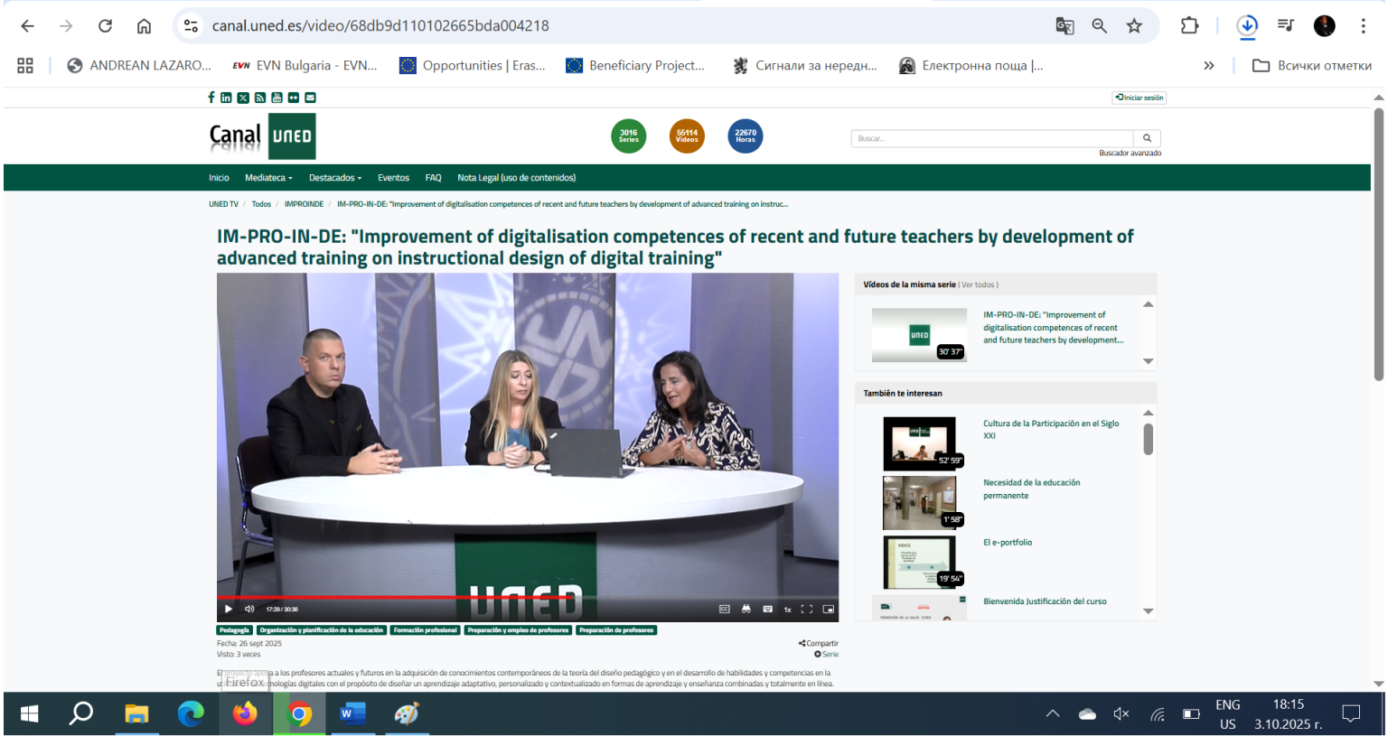 The video class titled “IM-PRO-IN-DE: ‘Improvement of digitalisation competences of recent and future teachers by development of advanced training on instructional design of digital training’” is now available on UNED Channel. Here you may find all information related to the pilot implementation phase and presentation of the project results by Prof. PhD Cristina Sanchez Romero (UNED), Prof. PhD Pilar Gutiez Cuevas (AMPAT) and Mr. Andrean Lazarov (BIST). It was promoted via UNED TV Channel with more than 200 000 students and teachers all over Spain and Latin America.